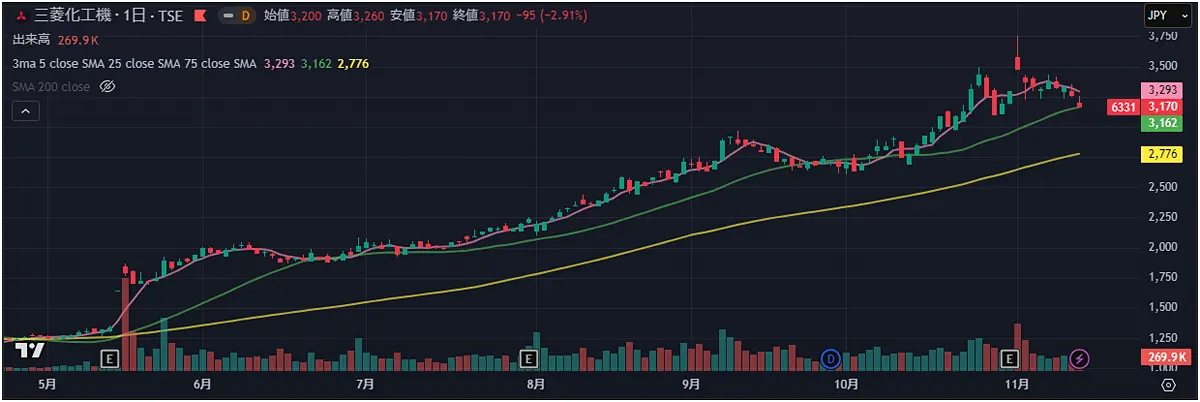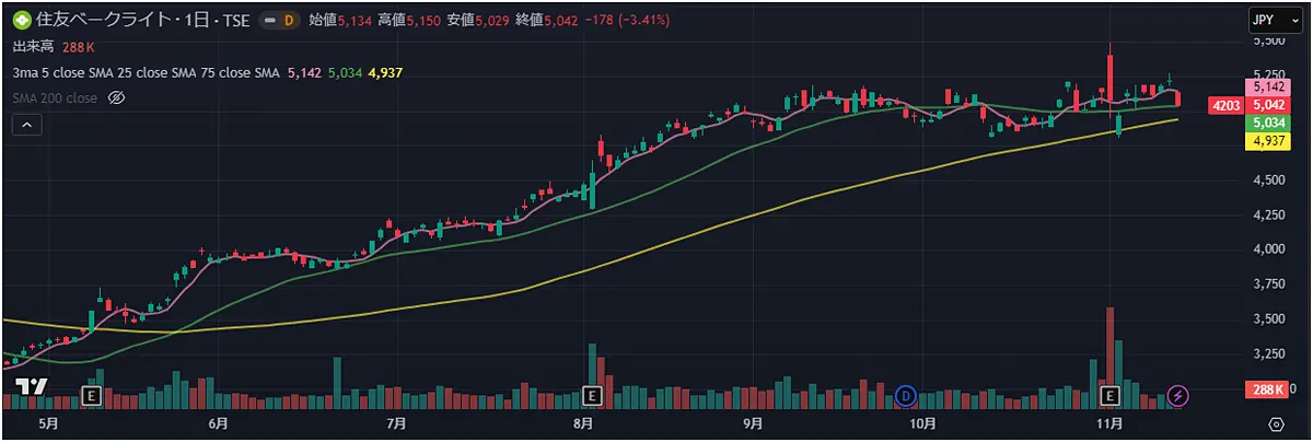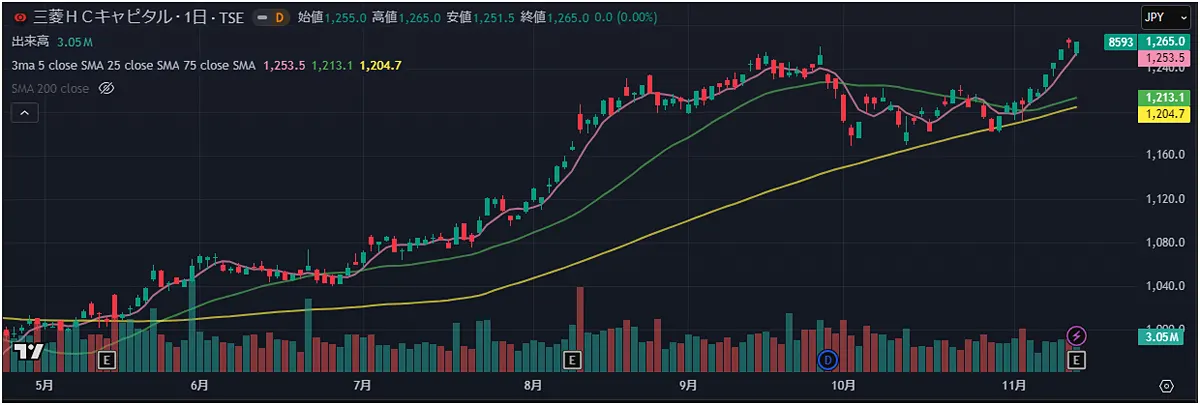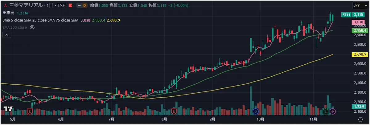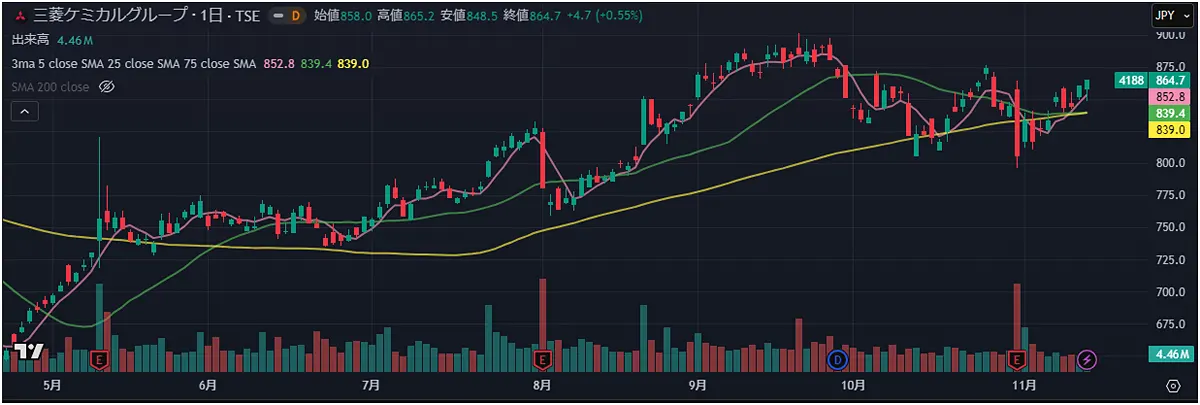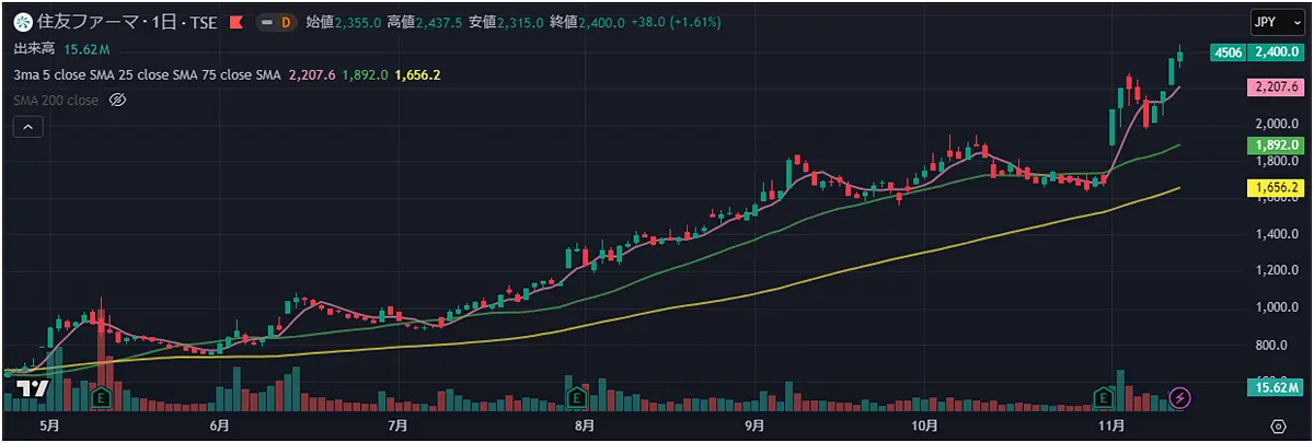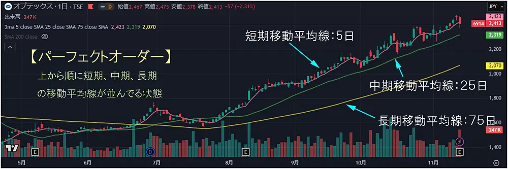 それぞれ20銘柄ほど抽出できたが、その中で「東証プライム上場、ほぼ半年ほどパーフェクトオーダー」のものを載せてみた。