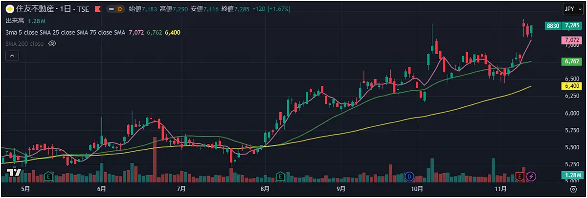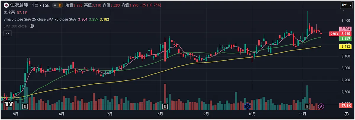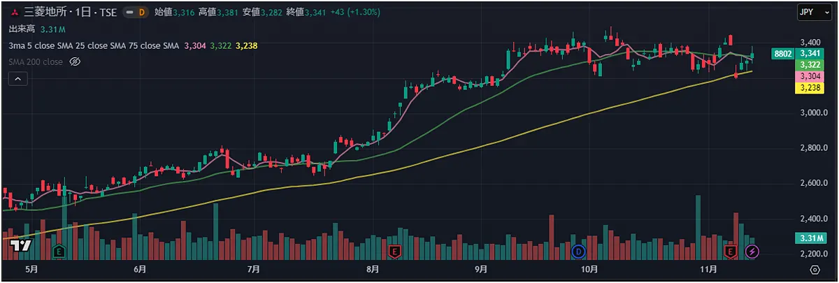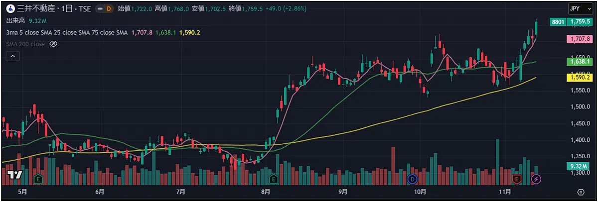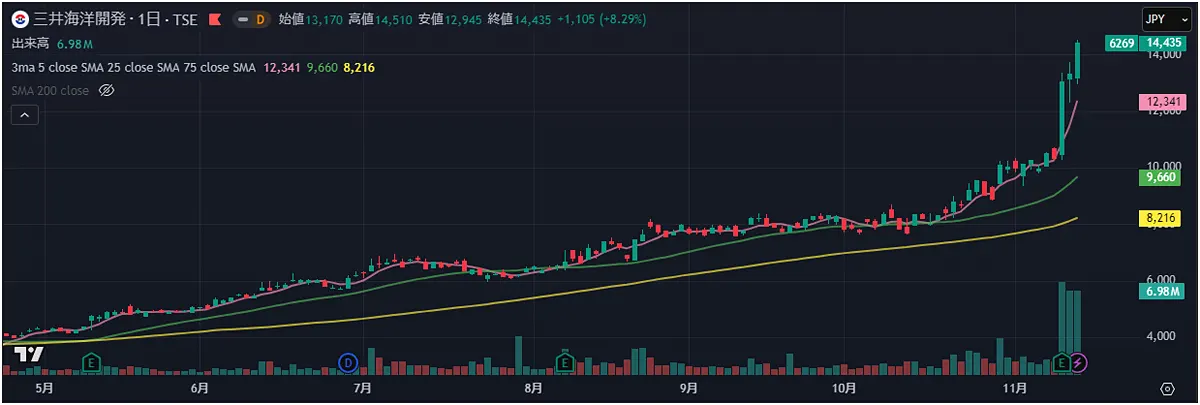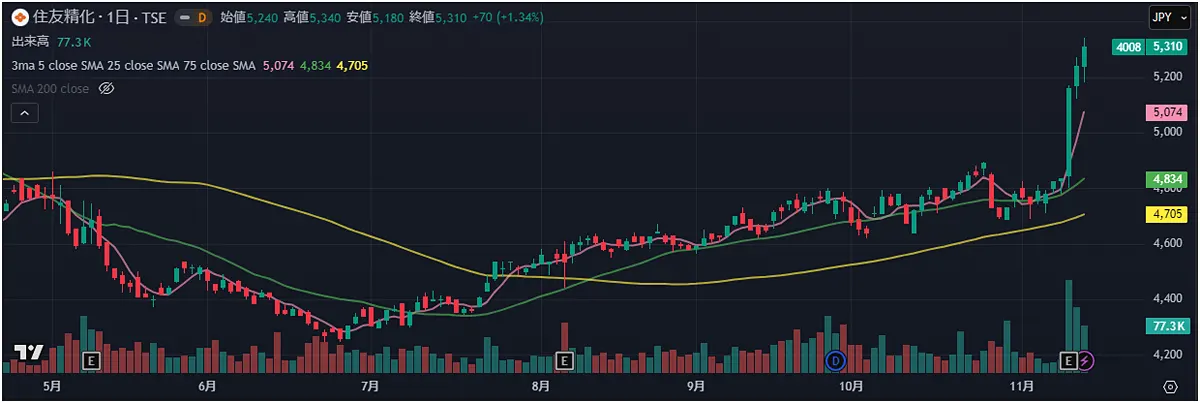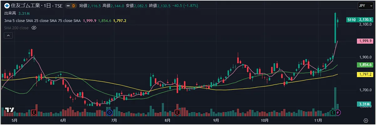 それぞれ20銘柄ほど抽出できたが、その中で「東証プライム上場、ほぼ半年ほどパーフェクトオーダー」のものを載せてみた。