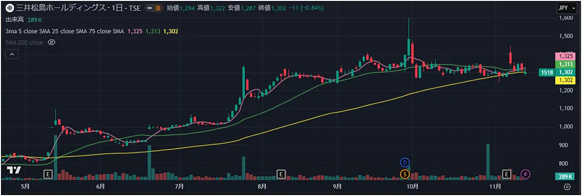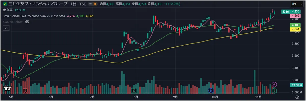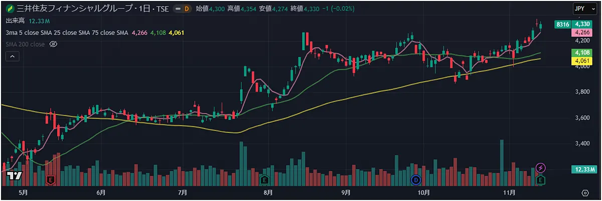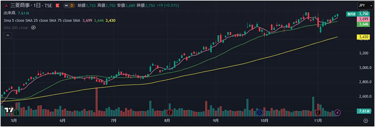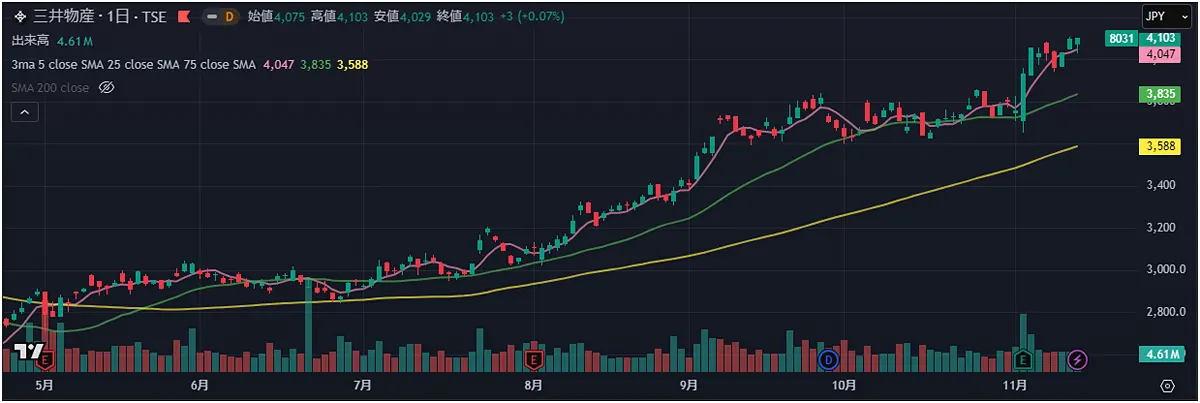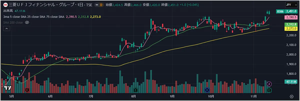 そこで、三大財閥銘柄で過去半年ほどでチャートが右肩上がりのものを調べてみた。
