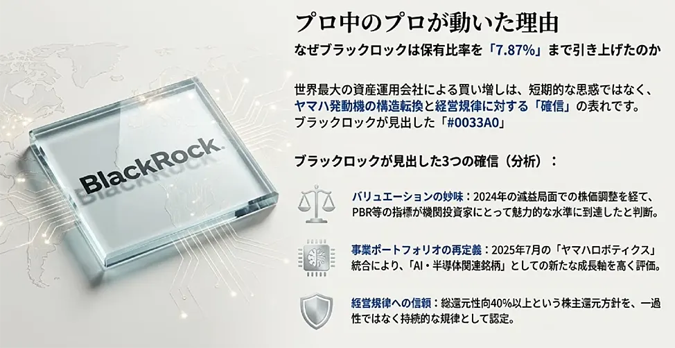 前述の「7272 ヤマハ発動機」であるが、配当金目的で購入しようと昨年末から考えていたところ、もしかしたら株価アップの可能性もあるかも。それは世界最大規模の投資会社「ブラックロック」の存在。この会社が昨年末、ヤマハの大量株式購入を発表したのだよ。これは期待できるかもと思った(*^^*)