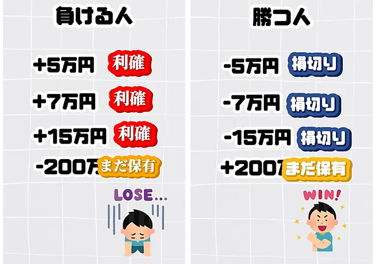 配当金目的のヤマハ購入で資金は130万ほどになるけど、これを元手にデイトレを始めるが、以前「2025年12月を振り返って」でも書いたように投資銘柄は「1801 大成建設」とする。この銘柄を単位未満株で10株単位で売買しようと思う。なるべくコツコツドカンにはならないように慎重にいこうと思う。以下の図のように損小利大を目標に「勝つ人」になりたい。