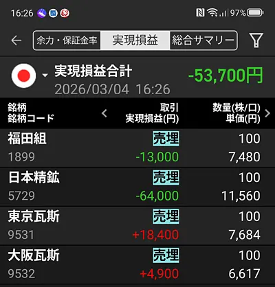 実害は今日のデイトレです。-53,700円。痛いですねえ。これで今月マイナスでやんす(T_T)